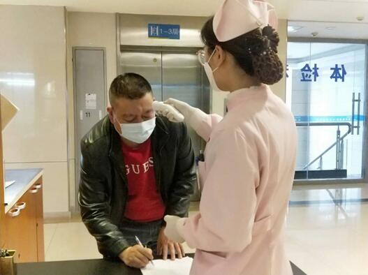 工作人員為體檢的每位員工個(gè)人信息進(jìn)行登記并測體溫