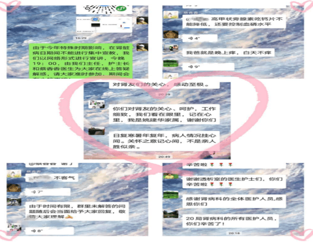 疫情期間,慢性腎臟病病友由于免疫力較低,加之服用激素或免疫抑制劑、血液透析、腹膜透析等原因已然成為新型冠狀病毒感染的高危人群。腎病學(xué)科王衛(wèi)軍主任就慢性腎臟病病友如何預(yù)防新型冠狀病毒的感染提出了幾點(diǎn)指導(dǎo)意見,從腎病的發(fā)病過程、如何防治腎病到血液透析治療多樣化的精細(xì)管理,使患者及患者家屬了解腎病,防治腎病,同時緩解了疫情帶來的心理壓力。護(hù)士長石娟從透析患者的日常飲食攝入技巧、透析患者如何控制體重做了詳細(xì)介紹,并將自己的臨床經(jīng)驗(yàn)分享大家,主治醫(yī)生蔡香香圍繞腎病并發(fā)癥的處理、透析患者頑固的皮膚瘙癢的預(yù)防與治療結(jié)合自己的診治經(jīng)驗(yàn)為腎友們進(jìn)行詳細(xì)的宣講,并在科室建立的腎友微信群中為腎友們提出的問題及時進(jìn)行線上解答。