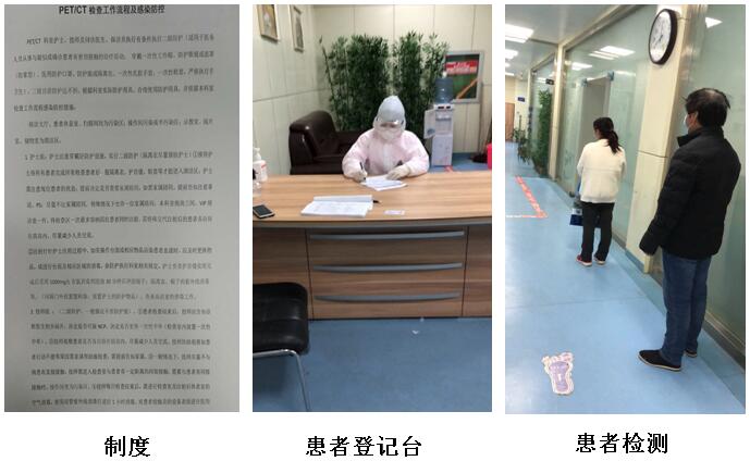 隨著新冠肺炎到來,為了避免院內(nèi)交叉感染,追求醫(yī)務人員“零感染”的目標,根據(jù)醫(yī)院要求,PET/CT室制定相關防護工作流程及感染防控策略。全科在核醫(yī)學工作場所要求的三區(qū)(“控制區(qū)、監(jiān)督區(qū)和非限制區(qū)”)劃分的基礎上,按照感控要求再次劃分“污染區(qū)、半污染區(qū)及清潔區(qū)”。進出各區(qū)時遵守相應的感控及核醫(yī)學工作場所相關要求。嚴格控制每日檢查人數(shù);在科室門口設立體溫檢測點,細心為患者測體溫,用酒精為患者消毒并交代注意事項,登記患者信息及聯(lián)系方式;設置獨立問診室,問診醫(yī)生實行佩戴護目鏡、帽子、口罩等,實行單獨問診;護士因與患者近距離接觸,實行二級以上防護,穿防護服、戴醫(yī)用外科口罩、戴防護帽、護目鏡并穿鞋套。候診區(qū)患者實行一人一間病人,告知患者零交流;患者家屬檢查區(qū)以外等候,保持一定的距離。
