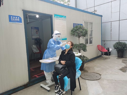 ——延安大學(xué)咸陽(yáng)醫(yī)院體檢科護(hù)理人員為核酸檢測(cè)人員采集鼻咽拭子