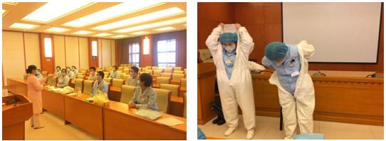 加強實驗室安全管理,確保在實驗的各個環(huán)節(jié)嚴格遵守防護準則。防微杜漸,在院感辦的協(xié)助下邀請趙靜護士長對科室人員進行三級防護裝備的穿戴演練。