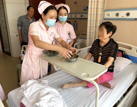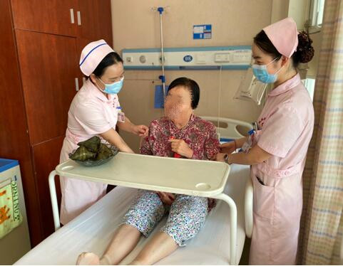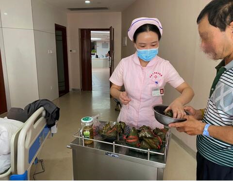 上午9點(diǎn) ,護(hù)士長(zhǎng)杜愛(ài)榮帶領(lǐng)護(hù)士推著送粽子車(chē),為患者送上香甜的粽子,并傳達(dá)了科室人員對(duì)住院患者的關(guān)心。8床的魏阿姨拿到粽子后,開(kāi)心的對(duì)醫(yī)護(hù)人員說(shuō),“感謝你們醫(yī)生和護(hù)士,技術(shù)精湛,服務(wù)溫馨,才有了我現(xiàn)在好的身體條件,一大早就收到了熱氣騰騰的粽子,感到非常溫暖,真是沒(méi)有想到住院還能享受到這么貼心的服務(wù),嘿嘿。”