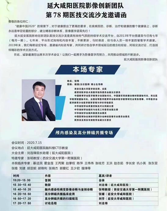 2020年7月15日,醫(yī)學(xué)影像科在腦血管病院CT室示教室舉辦第78期“醫(yī)技交流沙龍”活動,本次邀請到的專家是西安交通大學(xué)第一附屬醫(yī)院張明教授。