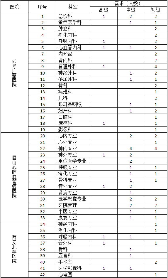因業(yè)務(wù)發(fā)展需要,現(xiàn)以上醫(yī)院面向社會(huì)招聘各專業(yè)臨床醫(yī)師,招聘條件、招聘崗位及招聘人數(shù)如下: