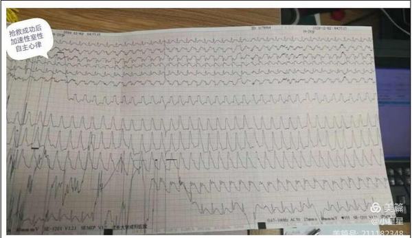 15分鐘后,患者王先生在家屬的陪同下來(lái)到了延安大學(xué)咸陽(yáng)醫(yī)院心血管病院11樓心六科,在吳醫(yī)生問(wèn)診及查體時(shí)患者胸痛再次發(fā)作,并于4點(diǎn)20分突然出現(xiàn)四肢抽搐、呼之不應(yīng),觸摸頸動(dòng)脈搏動(dòng)消失,呼吸呈嘆息樣,立即予以心肺復(fù)蘇術(shù),心電監(jiān)測(cè)提示心室停搏,與此同時(shí)我科楊登魁責(zé)任總醫(yī)師、我院心一科王銀濤醫(yī)師、心二科代雪茹醫(yī)師、心三科王巖醫(yī)師、留夜護(hù)士陳娜、心七科徐云鵬醫(yī)師、留夜護(hù)士高謙聞?dòng)嵹s來(lái),并立即投入緊張的搶救過(guò)程中,經(jīng)予持續(xù)胸外按壓、多次電除顫等治療后患者于4點(diǎn)40分意識(shí)逐漸恢復(fù),心電監(jiān)測(cè)示加速性室性自主心律,搶救成功,而早己就位的導(dǎo)管室同仁也做好了準(zhǔn)備工作,并于6點(diǎn)40分成功開通了患者閉塞血管,術(shù)后患者生命體征平穩(wěn)。