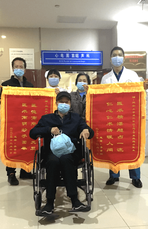 2020年12月11日下午,超聲科診室門口上演了溫馨一幕:患者李某攜其家屬捧著“醫(yī)德高尚,瞾星無雙,醫(yī)術(shù)高明,妙手回春”、“醫(yī)術(shù)精湛,超占一流,仁心仁術(shù),情暖人間”的錦旗,再三感謝趙超占醫(yī)生和南曌星醫(yī)生對其疾病的精確診斷以及無微不至的關(guān)懷?;颊呒覍俦硎荆夯叵氪舜尉驮\經(jīng)歷,感嘆過程驚心動魄,是你們認真負責的工作態(tài)度和精湛的醫(yī)術(shù)救了我家老頭子,而且也改變了我們對醫(yī)生們的一些偏見,非常感謝醫(yī)院培養(yǎng)出這么優(yōu)秀的員工和優(yōu)秀的團隊,太謝謝你們了!