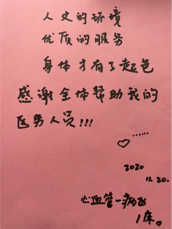 說起人文關懷,心血管內科一病區(qū)自2018年起在科主任和護士長的帶領下就逐步嘗試科室人文建設,從關心關愛患者著手,在科室領導帶領及監(jiān)督下,全體工作人員從自身做起,從小事作起,從患者進入科室的瞬間做起!那個時候科室成員從簡單的微笑開始,起立迎接新入院患者,詢問患者需求為患者安排床位,陪同患者進入病房,責任護士了解患者的基本狀況及需求,為患者提供相應的服務這些基本的護理措施做起;在完成基礎護理解除患者病痛的前提下,醫(yī)護均可以自發(fā)的為無家屬陪伴的患者接水、買飯,發(fā)自內心的陪焦慮患者聊天,鼓勵說出自己內心的想法,并積極進行解決!
