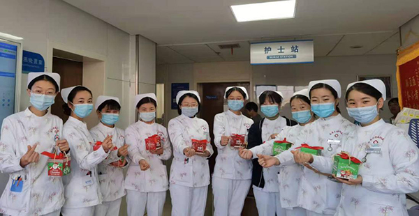 12月24日,延安大學(xué)咸陽醫(yī)院血液內(nèi)分泌科滿心溫暖,其樂融融?;颊邆円桓钠饺盏钠届o,整個(gè)病區(qū)不時(shí)傳出陣陣笑聲。因?yàn)樗麄兌际盏搅丝剖揖臏?zhǔn)備的禮物——“平安果”。