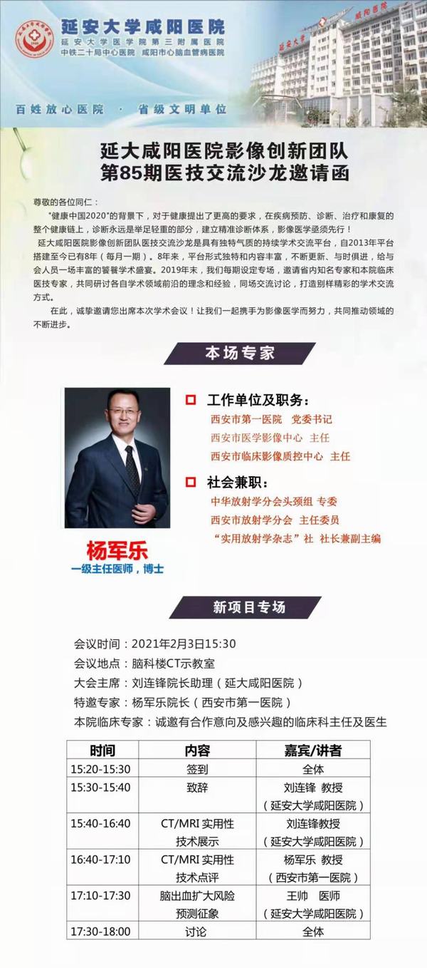 2021年2月3日,延安大學(xué)咸陽(yáng)醫(yī)院第85期醫(yī)技交流活動(dòng)在腦科樓CT/MRI示教室成功舉辦,延安大學(xué)咸陽(yáng)醫(yī)院院長(zhǎng)助理兼醫(yī)學(xué)影像科主任劉連鋒教授主持,特邀西安市第一醫(yī)院楊軍樂教授、涇陽(yáng)縣醫(yī)院米偉主任團(tuán)隊(duì)及我院影像醫(yī)、技、護(hù)參加本次會(huì)議。