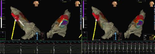 近日,我院心血管內(nèi)科三病區(qū)獨立成功完成了首例三維標測系統(tǒng)指導下的室早射頻消融術。由電生理團隊蔡萍主任醫(yī)師為術者。病人是一位48歲男性患者,心悸、心臟漏跳感8月,24小時動態(tài)心電圖提示室性早博20764個(室早負荷約20%),體表心電圖特點判斷室早起源于右室流出道,診斷為特發(fā)性室性早搏。反復藥物治療患者癥狀無明顯改善。根據(jù)國內(nèi)外室性心律失常治療指南,患者有導管射頻消融指征。充分與患者溝通后并積極完善術前準備,于2020年2月21日在Ensite三維標測系統(tǒng)指導下,通過激動標測及起搏標測,確定消融靶點位于右室流出道游離壁。以30W和43°消融8秒時,室早消失,共消融120秒。觀察30分鐘,應用異丙腎上腺素激發(fā),均無室早出現(xiàn),手術順利完成。術后心電圖檢查未見室早,患者的心悸等癥狀消失。