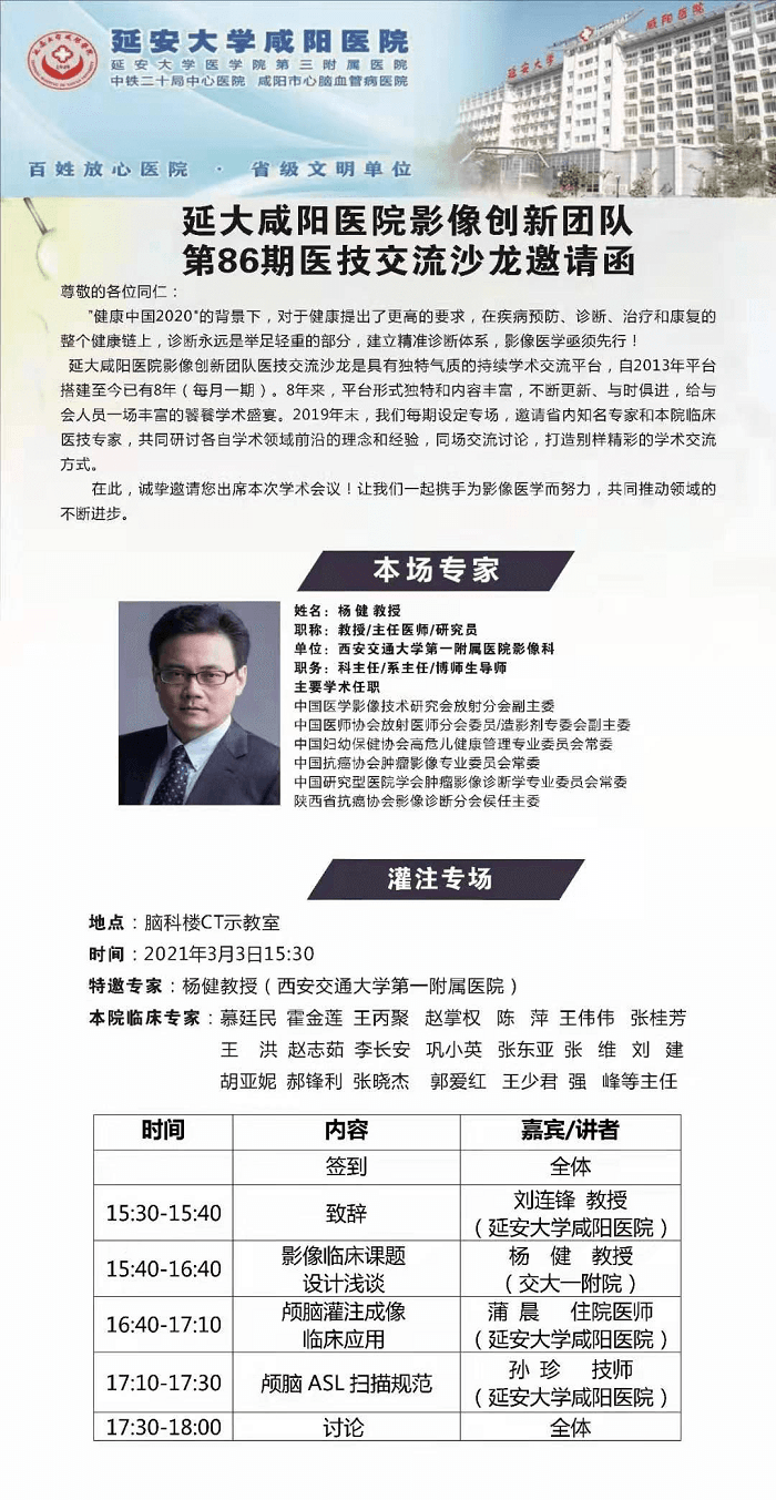 2021年3月3日,延安大學(xué)咸陽(yáng)醫(yī)院第86期醫(yī)技交流活動(dòng)在腦科樓CT/MRI示教室成功舉辦,延安大學(xué)咸陽(yáng)醫(yī)院院長(zhǎng)助理兼醫(yī)學(xué)影像科主任劉連鋒教授主持,特邀西安交通大學(xué)第一附屬醫(yī)院楊健教授、神經(jīng)內(nèi)科一病區(qū)王西愿責(zé)任總、神經(jīng)內(nèi)科二病區(qū)趙掌權(quán)主任、神經(jīng)內(nèi)科三病區(qū)陳萍主任、神經(jīng)內(nèi)科五病區(qū)王洪主任、神經(jīng)內(nèi)科六病區(qū)趙志茹主任、神經(jīng)內(nèi)科七病區(qū)李長(zhǎng)安主任、神經(jīng)內(nèi)科八病區(qū)鞏曉英主任、老年病區(qū)霍金蓮主任、神經(jīng)內(nèi)科十病區(qū)張東亞主任、神經(jīng)內(nèi)科十一病區(qū)張絨責(zé)任總醫(yī)師、神經(jīng)內(nèi)科十三病區(qū)韓霞責(zé)任總醫(yī)師、神經(jīng)內(nèi)科VIP一病區(qū)王合作責(zé)任總醫(yī)師、神經(jīng)內(nèi)科VIP二病區(qū)王少君主任、中醫(yī)科強(qiáng)峰主任及超聲科王英莉副主任等臨床與醫(yī)技醫(yī)師參加本次活動(dòng)。我院影像及臨床醫(yī)、技、護(hù)共60余人參加了本次會(huì)議。