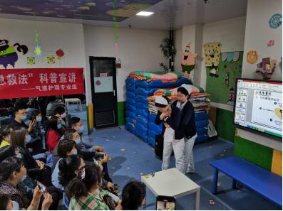 孫露露護師及氣道專業(yè)組成員演示海姆立克急救法的具體操作步驟,并請老師及家長們體驗,強調(diào)在具體實施中的注意事項。