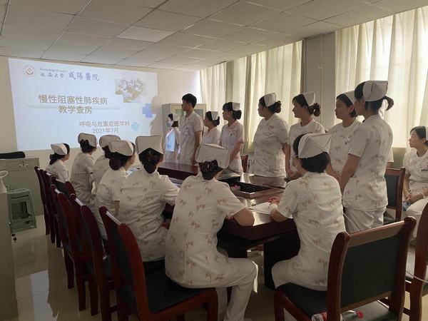 此次查房以“慢性阻塞性肺疾病患者的教學(xué)查房”為主題,采取PPT教學(xué)與實(shí)際查房相結(jié)合教學(xué)形式,緊緊圍繞慢阻肺患者最需解決的臨床問題展開。整個(gè)過程包括病情匯報(bào)、教學(xué)目標(biāo)介紹、床旁觀摩、臨床討論、歸納總結(jié)等環(huán)節(jié)。旨在通過此種形式,指導(dǎo)實(shí)習(xí)護(hù)士在實(shí)踐中靈活運(yùn)用所學(xué)理論知識(shí)解決患者實(shí)際問題,促進(jìn)其判斷、分析、解決問題能力的提高,同時(shí)使帶教老師教學(xué)查房的組織能力得到鍛煉。