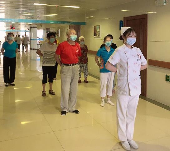 “快,快,快!音樂響了!”16床阿姨喊道。每到16:00,伴隨著音樂聲的響起,病區(qū)走廊都會出現(xiàn)一道靚麗的風(fēng)景線!看,我們的護士姐妹們,正在帶領(lǐng)叔叔、阿姨們跳操呢!