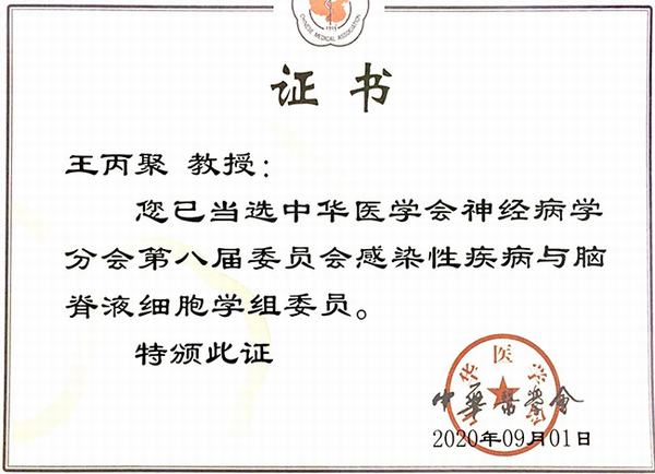 王丙聚教授當(dāng)選為第八屆中華醫(yī)學(xué)會(huì)神經(jīng)病學(xué)分會(huì)感染性疾病與腦脊液細(xì)胞學(xué)組委員會(huì)委員