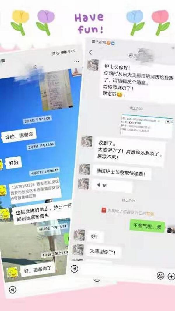 為了方便溝通、交流,我們?cè)诳剖裔t(yī)患交流群內(nèi)進(jìn)行了公示,群里專人負(fù)責(zé),為患者答疑解難?;颊叱鲈簳r(shí),我們也會(huì)發(fā)放科室名片、出院宣教內(nèi)容等。有快遞需求的患者通常只需一通電話,一條信息,告知我們?cè)敿?xì)的地址。我們就會(huì)當(dāng)日安排快速郵寄!看似細(xì)小的舉動(dòng),卻解決了患者的燃眉之急,贏得了患者和家屬的舉手稱贊。