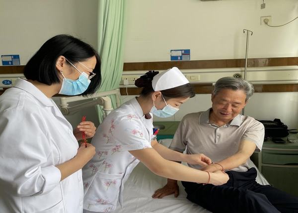 “每逢佳節(jié)倍思親!”為了讓患者在醫(yī)院感受到家的溫暖,隨后,醫(yī)護人員又給每一位患者系上祈福納吉的“五彩繩”。一聲聲“端午安康”,傳遞著溫馨的“醫(yī)患情”!禮物雖小,卻代表了我們科室全體醫(yī)護人員的一份心意,更體現(xiàn)了醫(yī)院對患者無微不至的人文關(guān)懷與優(yōu)質(zhì)的服務(wù)內(nèi)涵。希望他們在延安大學(xué)咸陽醫(yī)院度過一個安康、開心的端午節(jié),同時祝福他們早日康復(fù)。