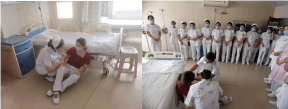 演練開始,責(zé)任護(hù)士楊娟花巡視病房時發(fā)現(xiàn)一名患者從床上起身時突發(fā)頭暈滑落床邊,在安撫好病人的同時立即通知值班護(hù)士張永梅呼叫主管醫(yī)生宋張鵬和患者家屬,主管醫(yī)生宋張鵬迅速到場判斷患者情況,協(xié)助楊娟花護(hù)士將患者扶到病床上休息,進(jìn)行查體,護(hù)士張永梅測量患生命體征,在確認(rèn)患者無礙后,囑其臥床休息,臨床觀察,責(zé)任護(hù)士安撫家屬和患者,并再次進(jìn)行健康宣教。