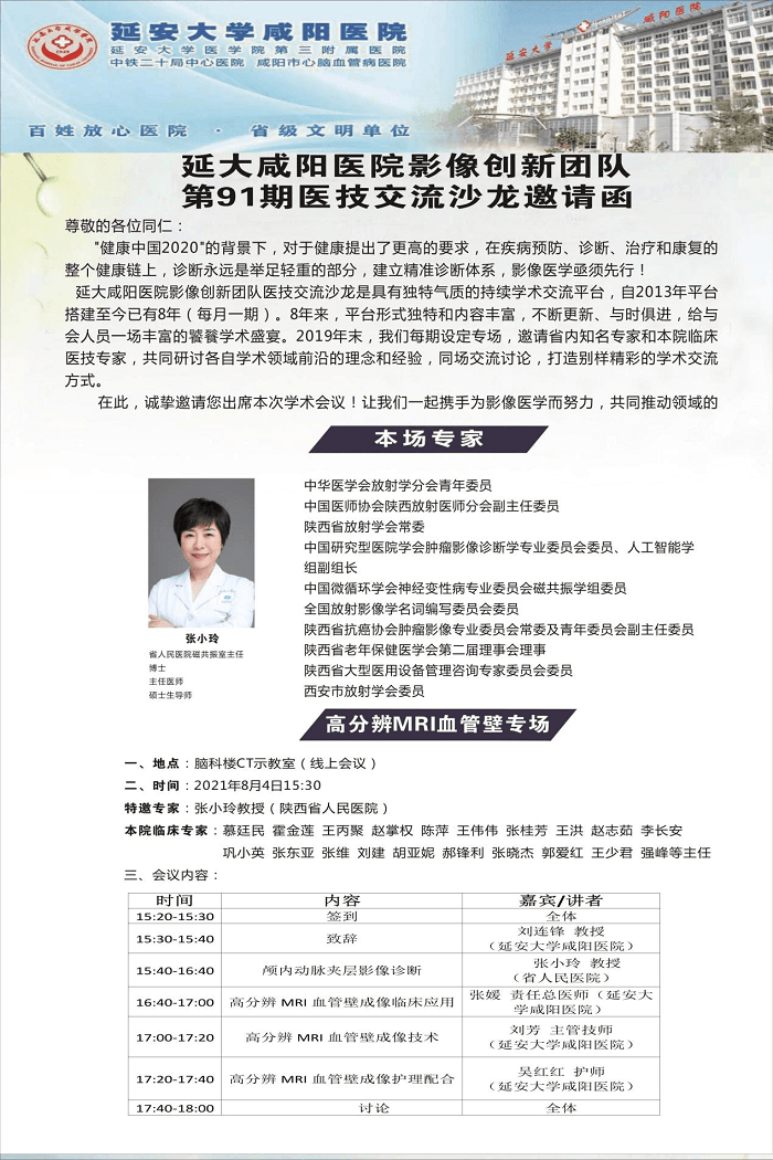 為統(tǒng)籌做好新冠肺炎疫情防控和“醫(yī)技交流沙龍”活動(dòng)的開展,2021年8月25日,延安大學(xué)咸陽醫(yī)院第91期醫(yī)技交流活動(dòng)延遲兩周后,在腦科樓CT/MRI示教室成功舉辦,會(huì)議采用遠(yuǎn)程設(shè)備、以線上方式進(jìn)行,由延安大學(xué)咸陽醫(yī)院院長助理兼醫(yī)學(xué)影像科主任劉連鋒教授主持,特邀陜西省人民醫(yī)院磁共振室主任張小玲教授線上遠(yuǎn)程授課指導(dǎo),我院神經(jīng)內(nèi)科十病區(qū)張東亞主任、心內(nèi)VIP王顯利主任等臨床專家參加本次活動(dòng),我院影像及臨床醫(yī)、技、護(hù)共40余人參加了本次會(huì)議。