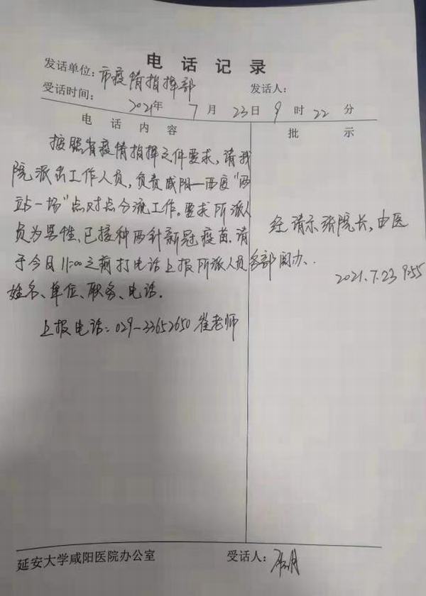 2021年7月23日,延安大學(xué)咸陽醫(yī)院接到咸陽市疫情指揮部下達(dá)的咸陽-西安“兩站一場”點對點疫情管控分流工作指令,我們保障部孫騰飛同志知曉應(yīng)征消息后,主動請纓,希望能接過英雄的接力棒,代表我們延安大學(xué)咸陽醫(yī)院出征。