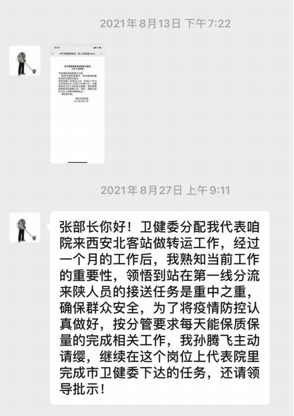 7月31日,孫騰飛同志隨著咸陽市疫情防控隊伍達(dá)到省疫情指揮部,被分配到西安高鐵站。孫騰飛積極主動熟悉了解省指揮部部署任務(wù)和要求,及時向醫(yī)院領(lǐng)導(dǎo)發(fā)微信匯報情況,并保證“請領(lǐng)導(dǎo)放心,保證完成任務(wù),不負(fù)使命”。他是這樣說的,也是這樣做到了。