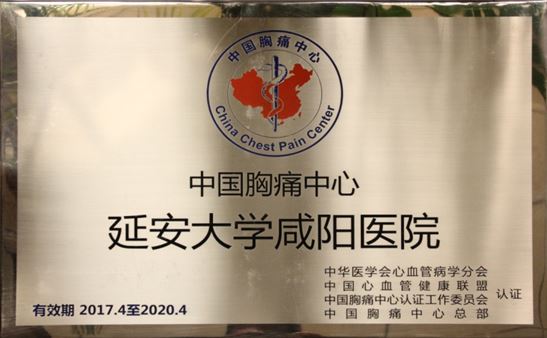 2017年4月6日,中華醫(yī)學會心血管分會,中國胸痛中心認證工作委員會,中國胸痛中心總部公告,延安大學咸陽醫(yī)院通過2017年第一批中國胸痛中心標準版認證。成為陜西省咸陽市首家獲得國家認證的胸痛中心。