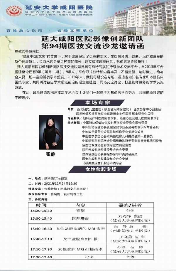 2021年11月24日,延安大學(xué)咸陽(yáng)醫(yī)院第94期醫(yī)技交流活動(dòng)在腦科樓CT/MRI示教室成功舉辦,延安大學(xué)咸陽(yáng)醫(yī)院院長(zhǎng)助理兼醫(yī)學(xué)影像科主任劉連鋒教授主持,特邀西北婦女兒童醫(yī)院張靜教授、我院婦科周云燕責(zé)任總醫(yī)師及其團(tuán)隊(duì)等臨床與醫(yī)技醫(yī)師參加本次活動(dòng)。我院影像及臨床醫(yī)、技、護(hù)參加了本次會(huì)議。
