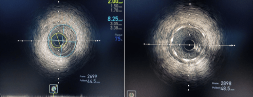 術(shù)前IVUS示最小管腔面積2.00mm2;術(shù)后IVUS示最小支架面積7.61mm2