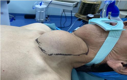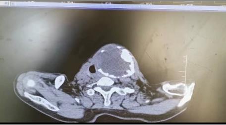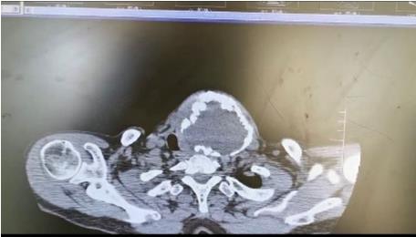 患者朱女士,68歲,頸部包塊呈進(jìn)行性增大50年,來院后彩超及CT提示左側(cè)甲狀腺腫瘤已經(jīng)超過10公分并邊緣鈣化,氣管移位較明顯,腫瘤較大屬于罕見,不僅給患者造成心理陰影,還影響了正常生活,偶有憋悶不適,進(jìn)食較大食物感哽咽不適。流動醫(yī)院下鄉(xiāng)義診時(shí),發(fā)現(xiàn)包塊已經(jīng)很大了,影響到頸部的活動及飲食。醫(yī)生與患者及家屬溝通講解病情,表示我們?nèi)揍t(yī)院能治療。最后患者及家屬抱著試一試的態(tài)度來到延安大學(xué)咸陽醫(yī)院。