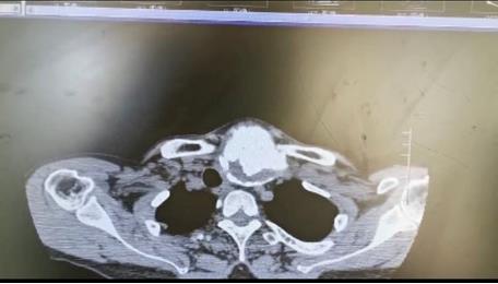 近日,延安大學(xué)咸陽醫(yī)院流動醫(yī)院在旬邑縣土橋鎮(zhèn)坡底村舉行大型多學(xué)科義診時(shí),篩查出一位罕見的巨大甲狀腺腫物,也就是以前的大脖子病。患者家住農(nóng)村,較偏僻,曾多次在村衛(wèi)生院及縣醫(yī)院就診,都說頸部位置手術(shù)難度大,風(fēng)險(xiǎn)太大,且目前患者不痛不癢的!覺得治療無望,一直拖著。