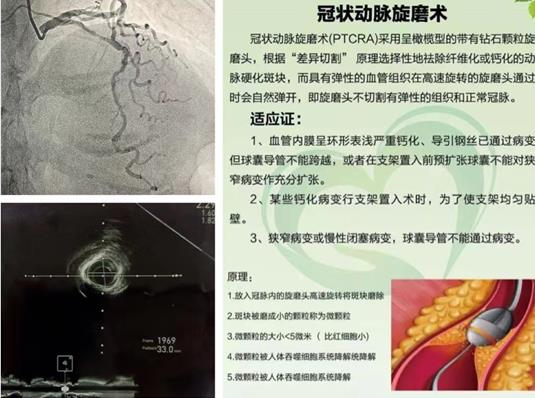 科普一下:什么是冠狀動脈嚴重鈣化?就是動脈血管壁上有層蛋殼樣的堅硬物質(zhì),相當于壁壘重重,常規(guī)的球囊、支架擴張技術難以充分擴張病變,從而影響介入治療的成功率和臨床效果。什么是冠脈旋磨術?是采用金剛石的磨頭以超高速將無彈性的斑塊組織磨除,不影響有彈性的血管壁。即使磨去極少量的鈣化病變,也常能改變病變的順應性,而使接下來的介入治療更容易。因此,冠脈鈣化病變對介入醫(yī)師來說是極大的挑戰(zhàn)。要保證冠脈嚴重鈣化病變手術成功首先需要病變處旋磨。旋磨后再植入支架可獲得更大的血管管腔和更滿意的臨床療效。