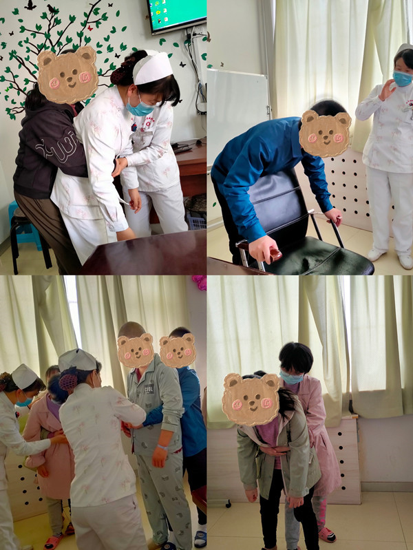 精神科患者服用抗精神病藥物常見(jiàn)的副反應(yīng)之一為吞咽困難,可能導(dǎo)致咳嗆或噎食,是危及患者生命安全的原因之一。為普及海姆立克法,提高患者及家屬自護(hù)、救護(hù)能力,在云科普節(jié)目后,王歌主管護(hù)師向患者講述了海姆立克法的原理,護(hù)士長(zhǎng)薛娜與王歌詳細(xì)講解了海姆立克法的步驟及動(dòng)作示范,并觀看視頻播放,從而讓在場(chǎng)家屬及患者更好的理解、學(xué)習(xí)海姆立克法。