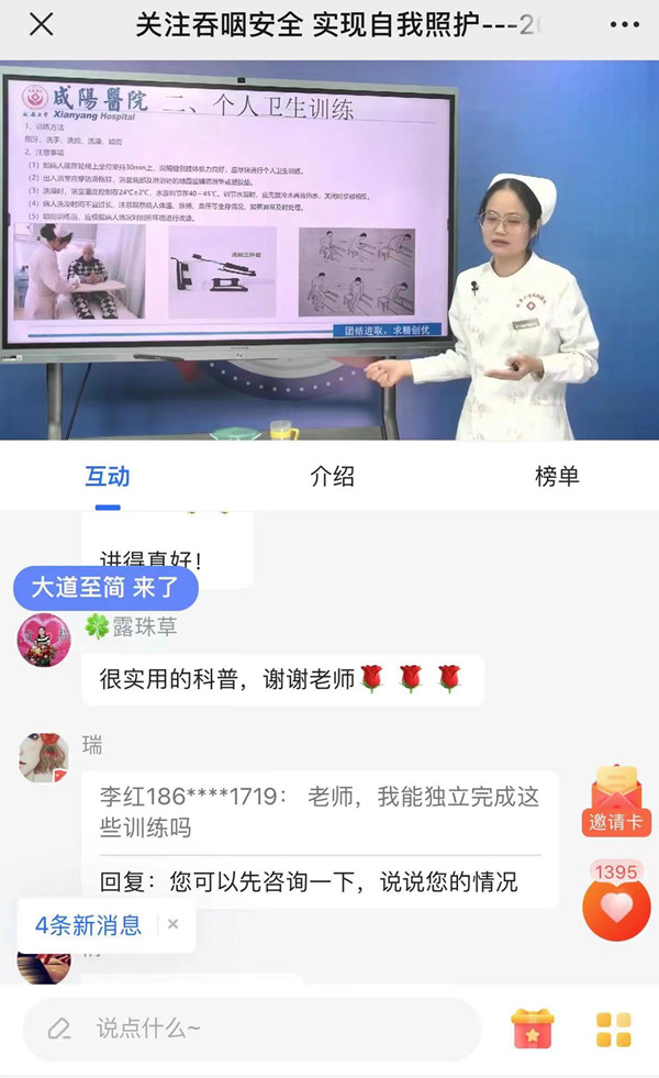 此次科普活動線上觀看人數(shù)達(dá)1916人次,點(diǎn)贊量6347次。直播同時評論區(qū)不斷有觀眾咨詢康復(fù)護(hù)理相關(guān)問題,??谱o(hù)士也一一進(jìn)行了耐心解答,受到了線上觀眾的一致好評,同時也了解到康復(fù)護(hù)理及康復(fù)訓(xùn)練的專業(yè)性、實(shí)用性和可操作性,更體現(xiàn)了??谱o(hù)士在醫(yī)學(xué)科普中的重要價值和不可替代的作用。