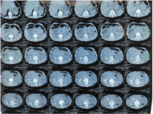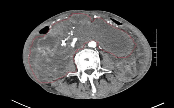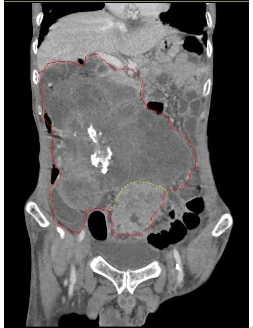 患者王大爺,男,72歲,發(fā)現(xiàn)腹腔腫物10余年,近兩年來患者雙下肢乏力、貧血,依靠間斷輸血維持著正常生活,出現(xiàn)頭昏,行動(dòng)困難,腹部疼痛及便血慕名來我院就診。入院后查體評(píng)估患者年齡大,體質(zhì)差,嚴(yán)重貧血,肺部感染及腸梗阻征象,腹部增強(qiáng)CT檢查提示腹膜后巨大腫瘤,長徑超過30厘米,占據(jù)大部分腹腔,并可能存在雙原發(fā)腫瘤。
