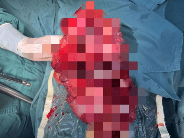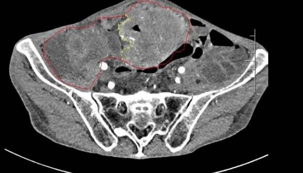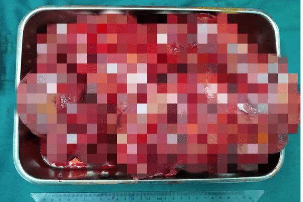 苗滿園腫瘤外科團(tuán)隊(duì)在麻醉科/手術(shù)室的緊密配合下為該患者進(jìn)行手術(shù),術(shù)中發(fā)現(xiàn)腫瘤巨大,幾乎占據(jù)了整個(gè)腹腔,從左側(cè)向右腹腔延伸,向上將肝、腎擠向膈下,向左將胃及小腸擠向左上腹,向下深達(dá)盆腔內(nèi),包繞下腔靜脈、腸系膜上動(dòng)脈等大血管及輸尿管,回盲部及回腸也受侵犯。手術(shù)難度巨大,風(fēng)險(xiǎn)極高。團(tuán)隊(duì)?wèi){借著高超的手術(shù)技能和精準(zhǔn)的手術(shù)預(yù)案沉著應(yīng)對(duì),迎難而上,應(yīng)用高頻電刀、超聲刀、切割縫合器等先進(jìn)設(shè)備,耗時(shí)近5小時(shí)為患者切除了巨大腹腔腫瘤,并聯(lián)合右半結(jié)腸切除,術(shù)中出血僅50ml。術(shù)后病理為腹膜后巨大平滑肌瘤+回腸腺癌。