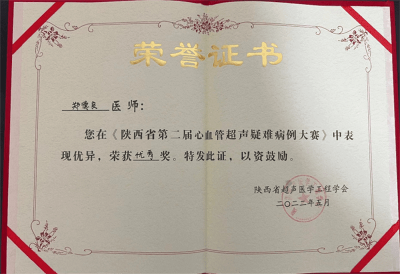 在陜西省超聲醫(yī)學工程學會超聲心動圖學組主辦,西安交通大學第一附屬醫(yī)院,空軍軍醫(yī)大學西京醫(yī)院承辦的“陜西省第二屆心血管超聲疑難病例大賽” 中,通過層層篩選,我科鄭德良主治醫(yī)師在地市級醫(yī)院為數(shù)不多的參賽選手中榮獲優(yōu)秀獎并獲點評老師高度評價。
