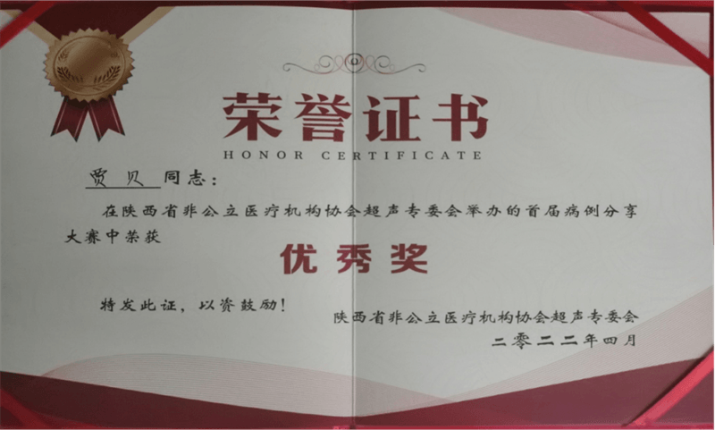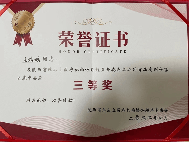 在陜西省非公立醫(yī)療機構(gòu)協(xié)會超聲專委會主辦,西安大興醫(yī)院承辦的“第一屆病例分享大賽”中,通過層層篩選,我科王媛媛主治醫(yī)師喜獲“三等獎”,王莎醫(yī)師代替賈貝主治醫(yī)師參賽喜獲“優(yōu)秀獎”。