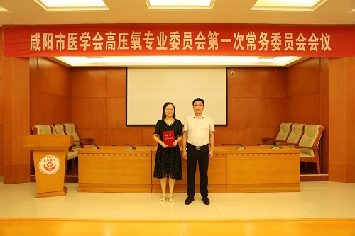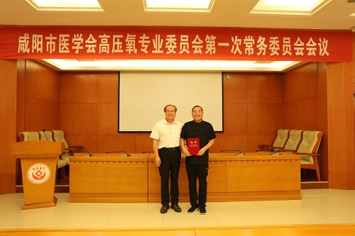 咸陽市醫(yī)學會會長陳劍輝為高壓氧專業(yè)委員會主任委員慕廷民同志頒發(fā)聘書