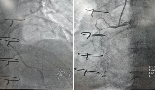 2022年9月16日行冠脈造影術(shù),造影結(jié)果示:左主干末端99%狹窄,LAD近段100%閉塞,LCX開口及近段95%狹窄,乳內(nèi)動脈-左前降支血管通暢,RCA近段100%閉塞,大隱靜脈橋血管未見,考慮閉塞。