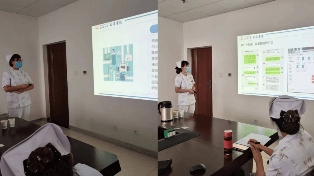 討論會在第一小組的病例收集過程展示中正式拉開帷幕,兩組成員緊緊圍繞本組疑點難點展開了討論,詳細的病史介紹、全面的診療經(jīng)過、準確的護理評估,都體現(xiàn)著護理人員的專業(yè)性;精美的PPT制作、抽絲剝繭的原因分析、中西醫(yī)的多點解決措施,都展示著護理人員的銳意進取。護士們還從不同的角度結(jié)合自身的工作經(jīng)驗就中樞性高熱除常規(guī)護理外還有哪些方法可以解決?便秘患者按摩腹部,何種手法?新設(shè)備器材應(yīng)用臨床需要解決的問題有哪些等方面進行了激烈的討論,同時對護理工作中易出現(xiàn)的問題提出了實用性、操作性強的解決方法,分享了心得和感受,現(xiàn)場發(fā)言積極、氣氛活躍。