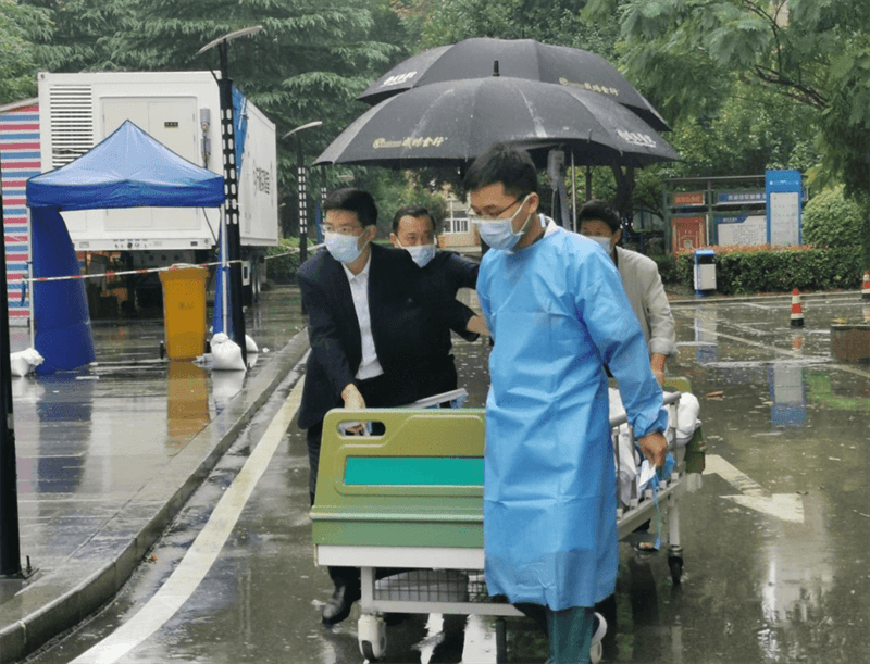 檢查完畢,在返回心血管樓途中,遇到了從心血管病院去外科病院用移動(dòng)病床推運(yùn)的患者,正值雨中,李衛(wèi)軍、王丙聚急患者之所急,想患者之所想,立即雨中送傘,將患者安全護(hù)送到外科大樓。
