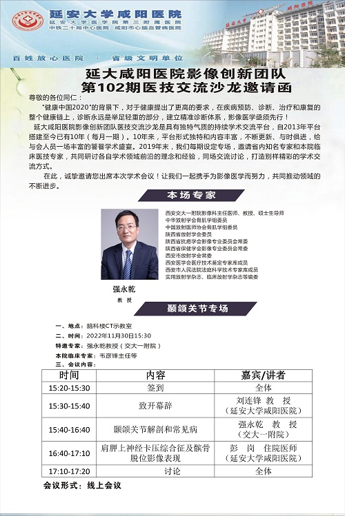 2022年11月30日,延安大學(xué)咸陽醫(yī)院第102期“醫(yī)技交流沙龍”活動在腦科樓CT/MRI示教室成功舉辦,會議由延安大學(xué)咸陽醫(yī)院院長助理兼醫(yī)學(xué)影像科主任劉連鋒教授主持,特邀西安交通大學(xué)第一附屬醫(yī)院強永乾教授線上遠(yuǎn)程授課指導(dǎo),我院口腔科韋彥鋒主任等臨床、影像專家及醫(yī)、技、護(hù)共40余人參加了本次會議。