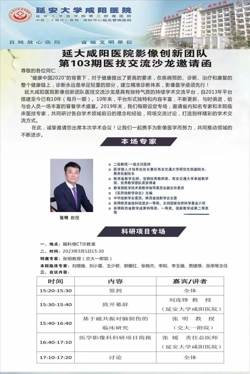 2023年3月1日,延安大學(xué)咸陽醫(yī)院第103期“醫(yī)技交流沙龍”活動(dòng)在腦血管病院大樓CT/MRI示教室成功舉辦,本次會(huì)議由延安大學(xué)咸陽醫(yī)院院長助理兼醫(yī)學(xué)影像科主任劉連鋒教授主持,特邀陜西省放射學(xué)會(huì)主任委員張明教授前來授課指導(dǎo)。咸陽市第一人民醫(yī)院放射科寇思杰主任,我院呼吸內(nèi)科賈建厚主任、神經(jīng)內(nèi)科VIP一病區(qū)郭愛紅主任、老年病科王少君主任、神經(jīng)外科一病區(qū)劉增強(qiáng)主任、普通外科二病區(qū)李玉強(qiáng)主任、放射科李彥龍主任及215醫(yī)院影像科張華文主任團(tuán)隊(duì)成員等臨床、影像專家及醫(yī)、技、護(hù)共40余人參加了本次會(huì)議。