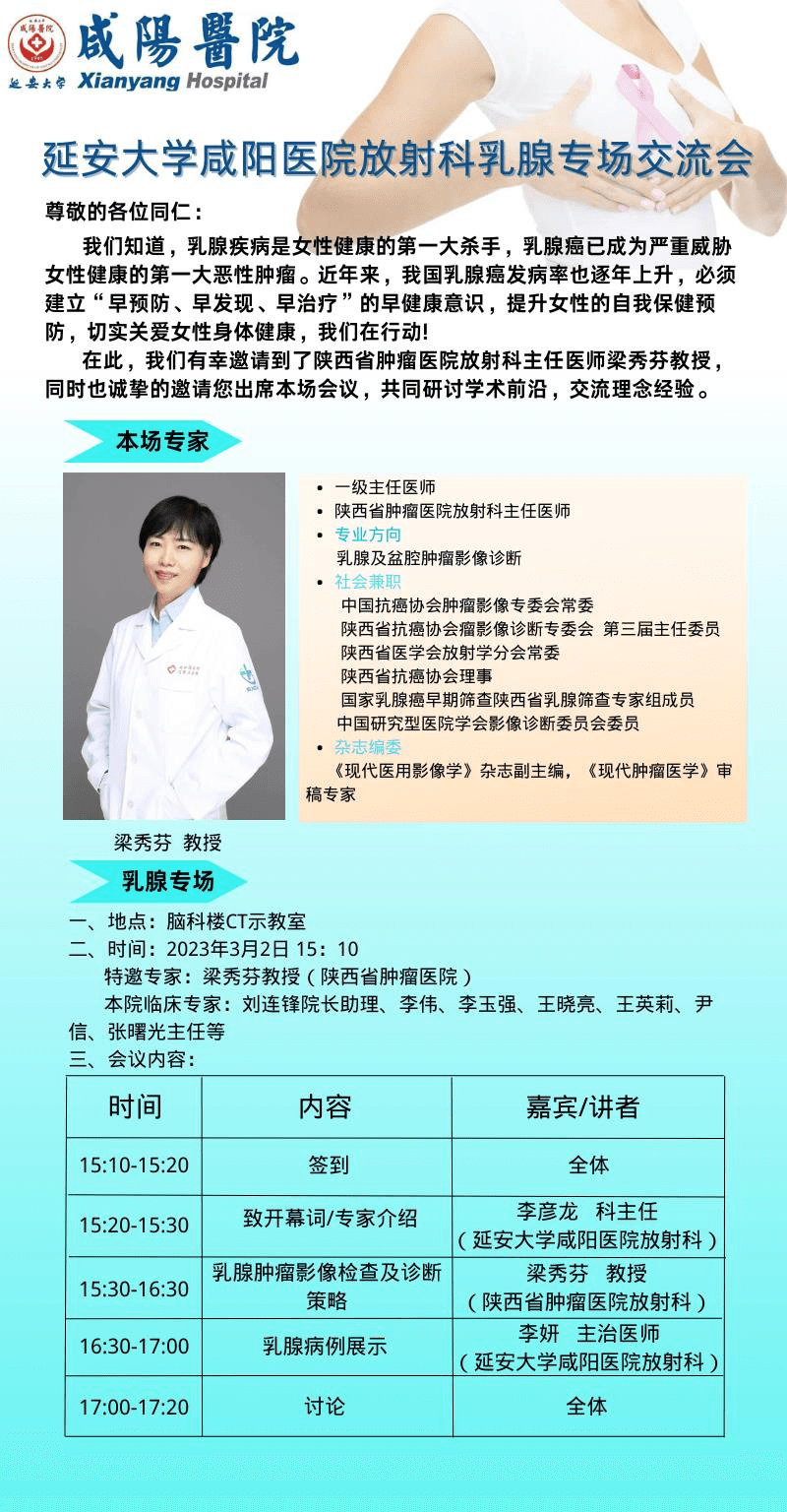 2023年3月2日,延安大學(xué)咸陽醫(yī)院X線診斷專業(yè)“乳腺專場交流會”在腦血管病院示教室成功舉辦,會議由X線診斷專業(yè)李彥龍副主任主持,特邀陜西省腫瘤醫(yī)院放射科主任梁秀芬教授現(xiàn)場授課指導(dǎo),劉連鋒院長助理、腫瘤胸外科李偉副主任、普通外科二病區(qū)李玉強副主任、放療科尹信主任、超聲診斷專業(yè)王英莉副主任等臨床、影像專家及醫(yī)、技、護(hù)共40余人參加了本次會議。