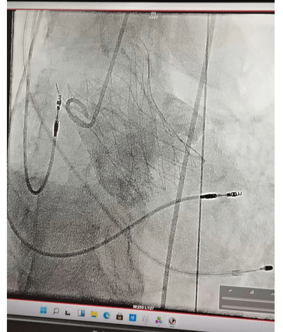 4月11日在全麻下行經(jīng)皮介入下主動脈瓣置換術(shù)。經(jīng)右側(cè)股動脈,在DSA引導(dǎo)下經(jīng)傳輸器將人工主動脈瓣膜送入主動脈瓣環(huán)內(nèi),定位準確后逐步釋放人工瓣膜,完成瓣膜置換,術(shù)后超聲顯示人工瓣膜固定良好,無瓣周漏,無返流。手術(shù)歷經(jīng)約兩小時順利結(jié)束,超聲顯示,主動脈瓣跨瓣壓差基本消失,返流大大減輕。手術(shù)獲得成功,術(shù)后患者24小時下床活動,恢復(fù)良好出院!