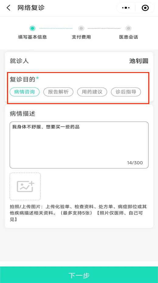點擊進入診室后,可編輯病情描述或發(fā)送圖片,醫(yī)生根據(jù)病情需要開具藥品。