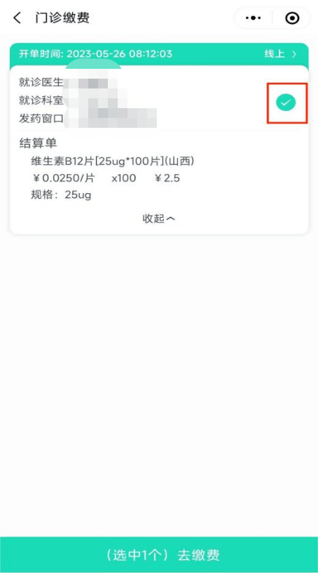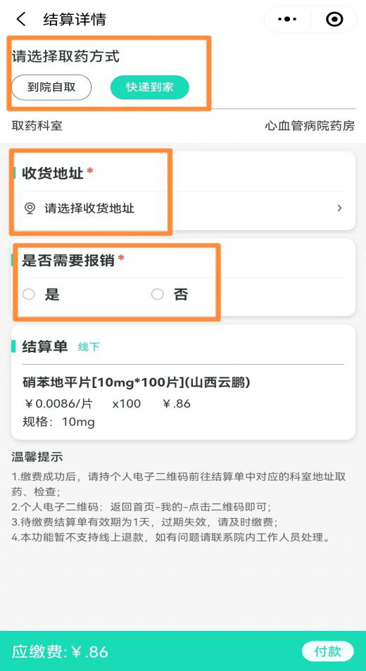 根據(jù)需求選擇取藥方式,填寫最終收貨地址,是否需要報銷,后點擊付款。