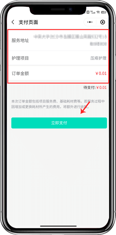 6、確認(rèn)無誤后點(diǎn)擊支付,等待護(hù)士聯(lián)系進(jìn)行護(hù)理項(xiàng)目評(píng)估