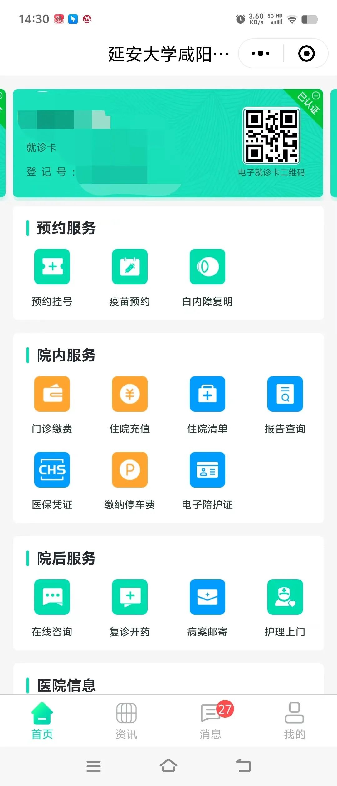 第1步:首先進(jìn)入延安大學(xué)咸陽(yáng)醫(yī)院互聯(lián)網(wǎng)醫(yī)院,點(diǎn)擊電子就診卡進(jìn)行注冊(cè)綁卡實(shí)名認(rèn)證。