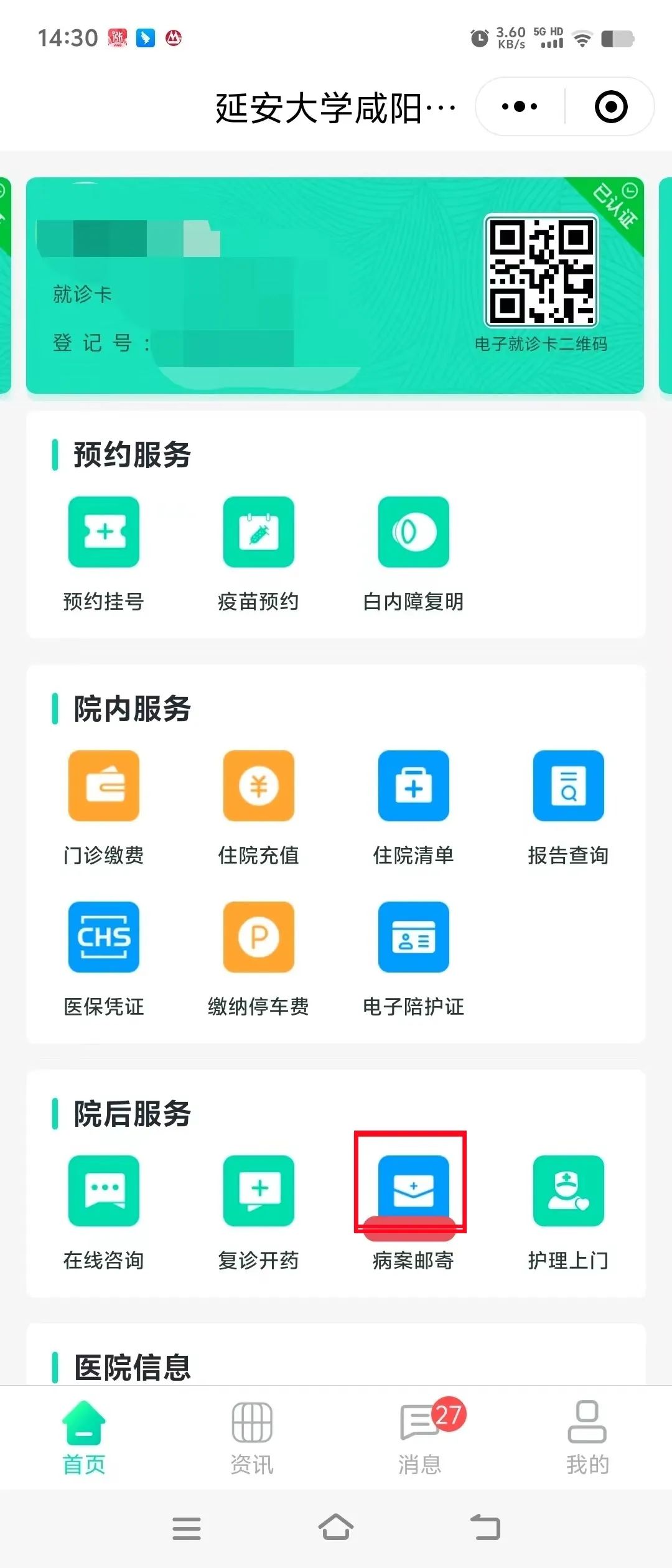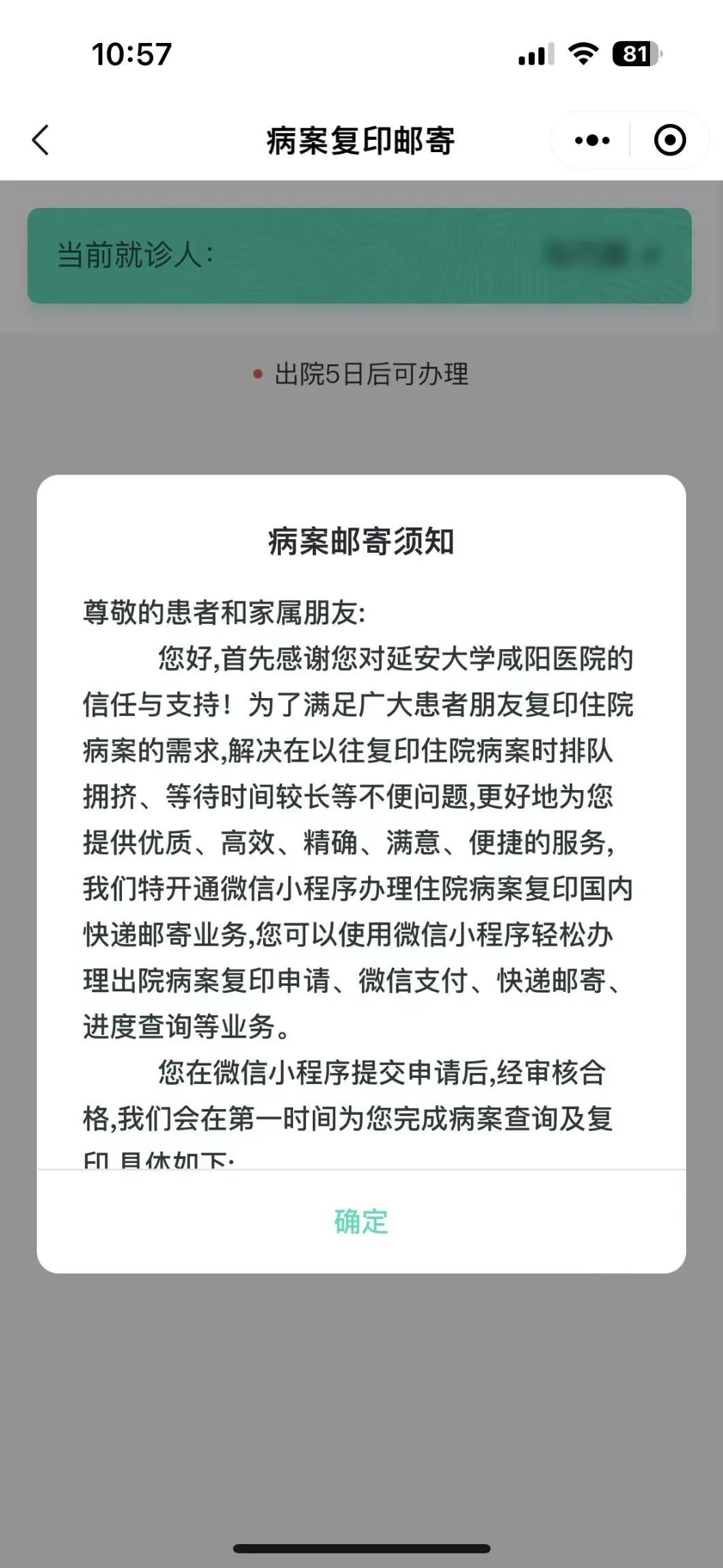 第2步:點(diǎn)擊【病案郵寄】,閱讀查看【病案郵寄須知】并選擇確認(rèn)。